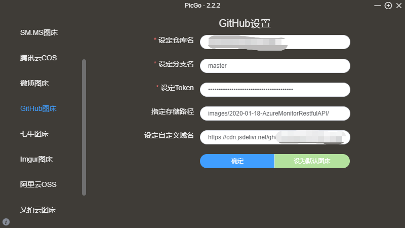 设定仓库名:存放图床的 Repo 名字,一般都是 xxx/xxx 格式;