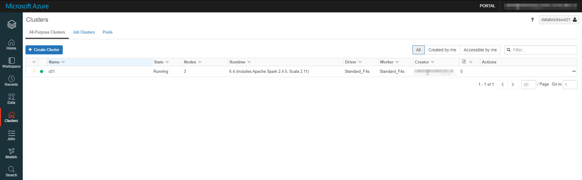 Azure Databricks 的创建过程是先需要在 Azure 上创建一个 Databricks 实体,然后在此基础上在实体内部创建 Workspace 以及 Cluster,再提交 Job 等等。针对 Databricks 资源,都会有唯一的 ID 和 Endpoint 与之对应,以便能够进行 Restful API 调用,集群通过 Databricks Portal 创建即可。本示例创建 1 Driver 2 Worker 共计 3 个节点的 Standard Cluster,Databricks 版本为 6.4 (includes Apache Spark 2.4.5, Scala 2.11)。如果需要做机器学习相关的计算,可以启用集成 GPU/ML 框架的版本,详细说明见官方文档,不做赘述。
