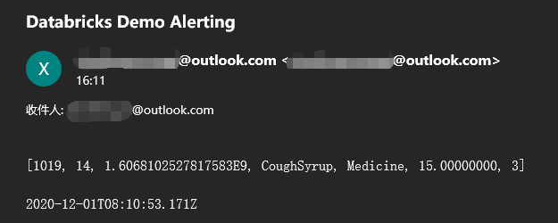 第一步订阅 Eventhub Entity alerting,第二步集成 Outlook 邮件接口发送告警邮件。所以当目标消息被筛选出来之后,LogicApp 就按照定义的邮件内容(本文是 Messages 内容和时间戳)来发送邮件,发送邮件的截图如下: